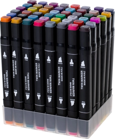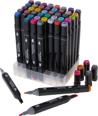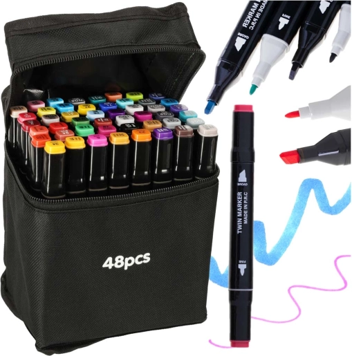 Oplev glæden ved farver med det alsidige sæt med 48 alkoholmarkører. To spidser på hver tusch – bred skråspids til udfyldning af større flader og fin spids til detaljerede linjer – giver dig frihed til at skabe illustrationer, skitser, tegneserier og lettering.