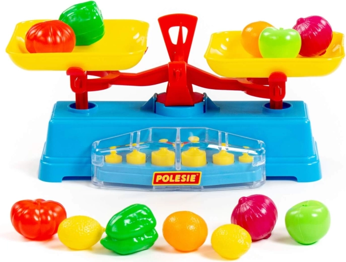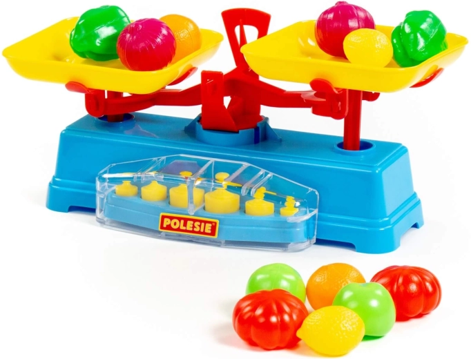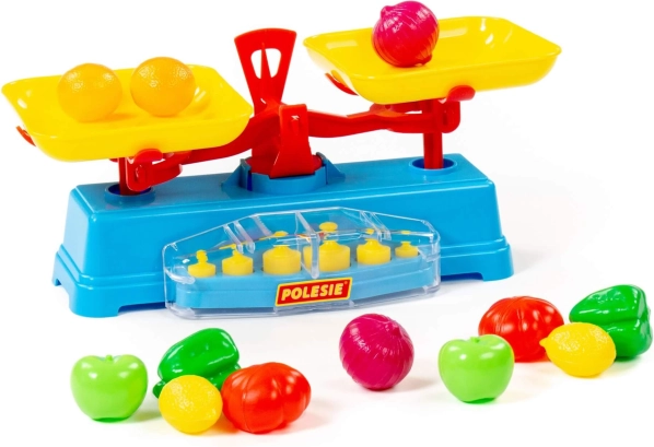 Legesættet indeholder en vægt, to skåle og 6 lodder.