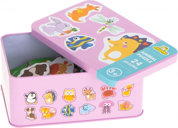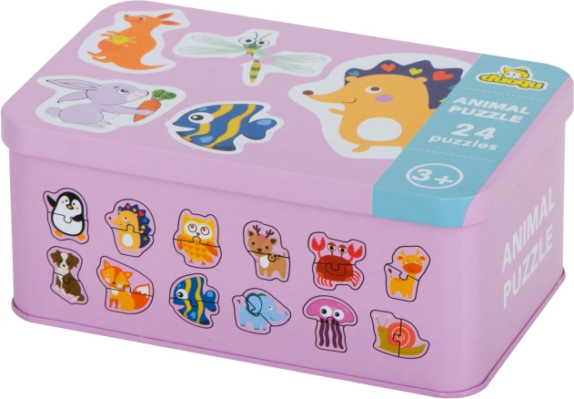 Puslespillene er opbevaret i en metalæske for nem opbevaring og transport. Ideel til rejser.