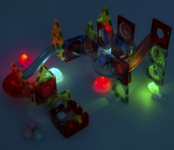 Farverige lysende kugler og reflektorer oplyser banen og forvandler hver konstruktion til et fængende syn. Ideel til leg i skumringen og til at øge børns motivation til at skabe.