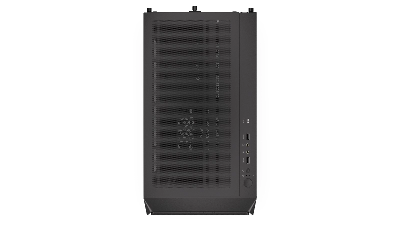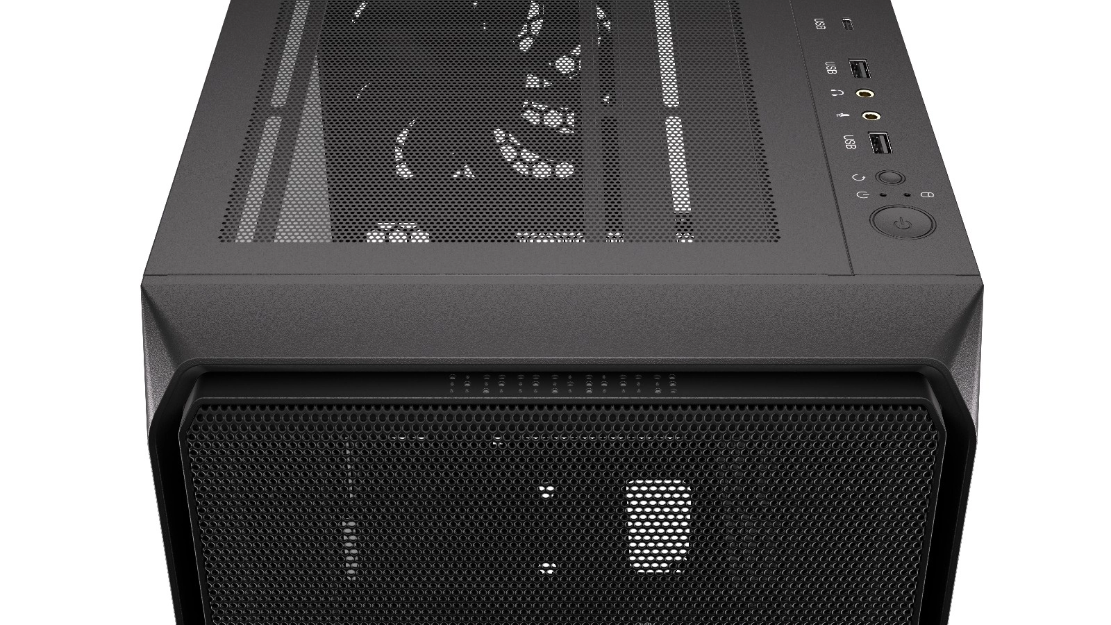 Moderne panel med USB‑C: Panelet tilbyder hurtig tilslutning via USB‑C 3.2 Gen 2, to USB‑A 3.2 Gen 1 og lydporte til hovedtelefoner og mikrofon.