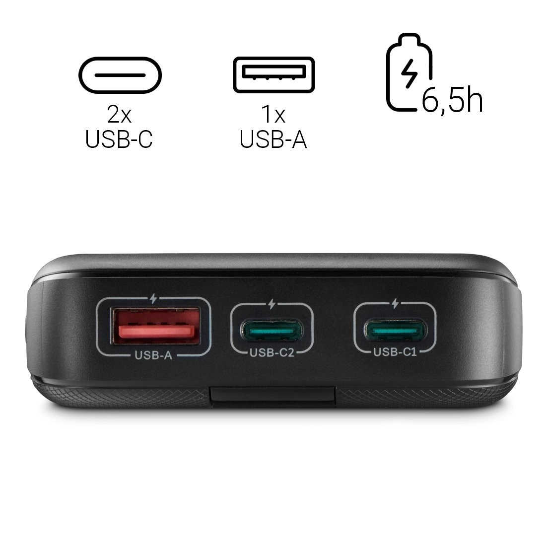 Vores powerbank muliggør opladning af op til tre enheder på én gang takket være to USB-C-porte og én USB-A-port. Det betyder, at du kan oplade telefon, tablet og smartwatch på samme tid, hvilket er meget praktisk på rejser eller på travle dage.