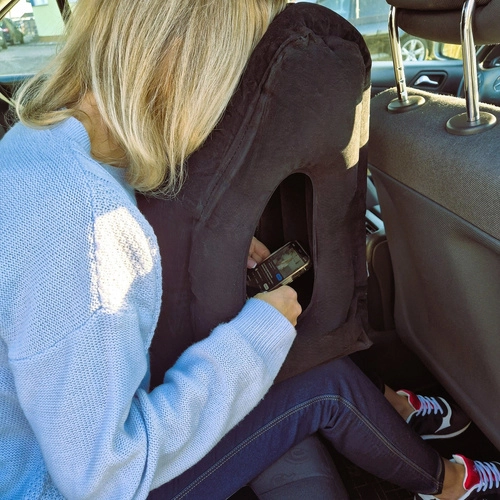 Udskæring til ansigtet og huller til hænderne giver mulighed for let at støtte hovedet og frit bruge telefonen. Perfekt løsning til lange rejser, tilbyder komfort og funktionalitet i ét.