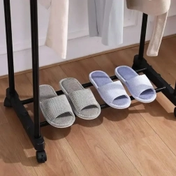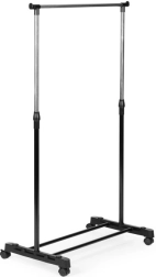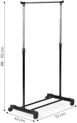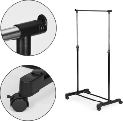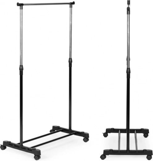 Lommerne i enderne af stativets bærende stang sikrer sikkerhed og eliminerer risikoen for uønsket glide eller skade på tøjet. Stangen fungerer også som en krog til ophængning af tasker, tørklæder, hatte og andre småting. Garderobestativet er udstyret med fire hjul, hvoraf to kan låses.<0strong> Dette muliggør let bevægelse og fleksibel rumorganisation. Det er en praktisk løsning, der giver mulighed for nem tilpasning af stativet til dine behov.<0p> En anden fordel ved dette stativ er bundhylden,<0strong> som er ideel til opbevaring af sko. Med denne hylde kan du holde din gang ren og organiseret. Hylden kan også bruges til opbevaring af andre småting såsom tasker, rygsække eller kasser med tilbehør, hvilket gør stativet til et endnu mere funktionelt møbelstykke.<0p><0div>Specifikationer<0h2>