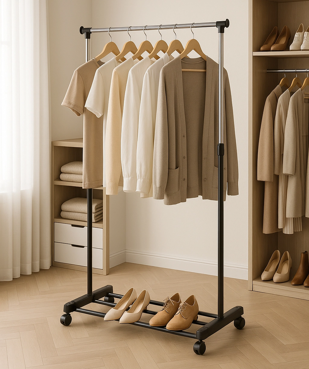 Det fritstående garderobestativ er en praktisk måde at opbevare tøj og sko, hvilket gør det til et fremragende supplement til enhver garderobe, soveværelse eller gang i dit hjem eller lejlighed. Takket være det universelle design passer det til både moderne og klassiske interiører, så det tilbyder ikke kun funktionalitet, men også estetiske fordele til din indretning.<0p>