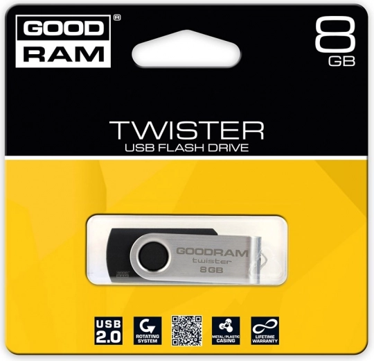 USB‑flashdrevet Goodram Twister 8GB kombinerer praktisk design og holdbarhed. Den roterende metalkappe beskytter USB‑stikket mod skader og snavs, hvilket sikrer lang levetid. Med læsehastigheder op til 20 MB/s og skrivehastigheder op til 5 MB/s leverer det effektiv ydeevne til dataarbejde.