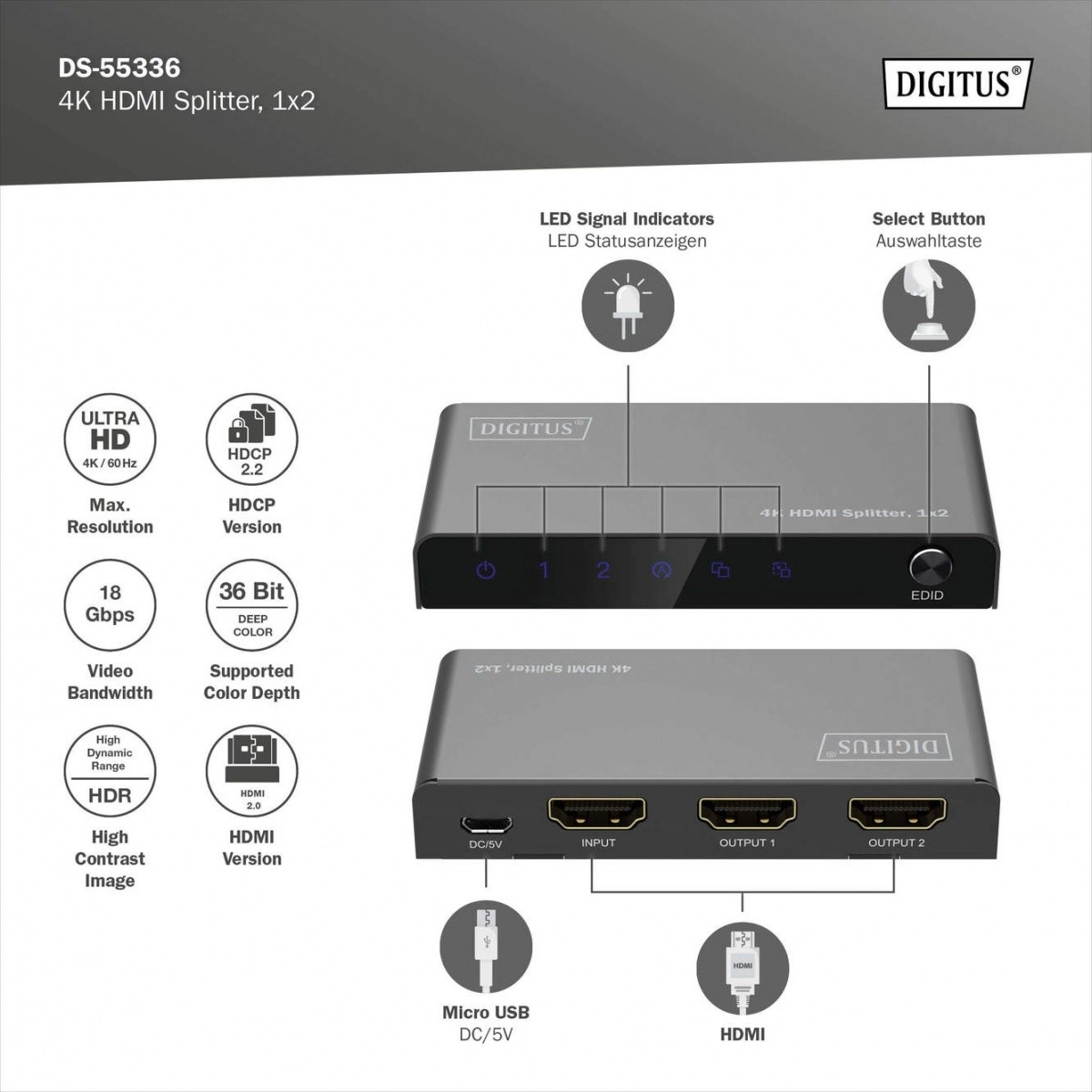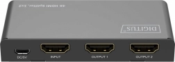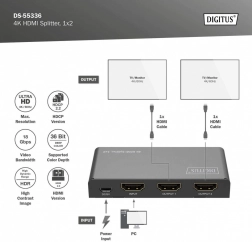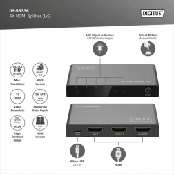 HDMI-splitter DIGITUS fordeler eller duplikerer audio- og videosignaler fra en HDMI-enhed til to udgange, hvilket muliggør visning på flere skærme samtidigt. Takket være downscaling-funktion understøttes visning af 4K på Full HD-skærme, hvilket gør samtidig brug af 4K- og Full HD-skærme muligt.