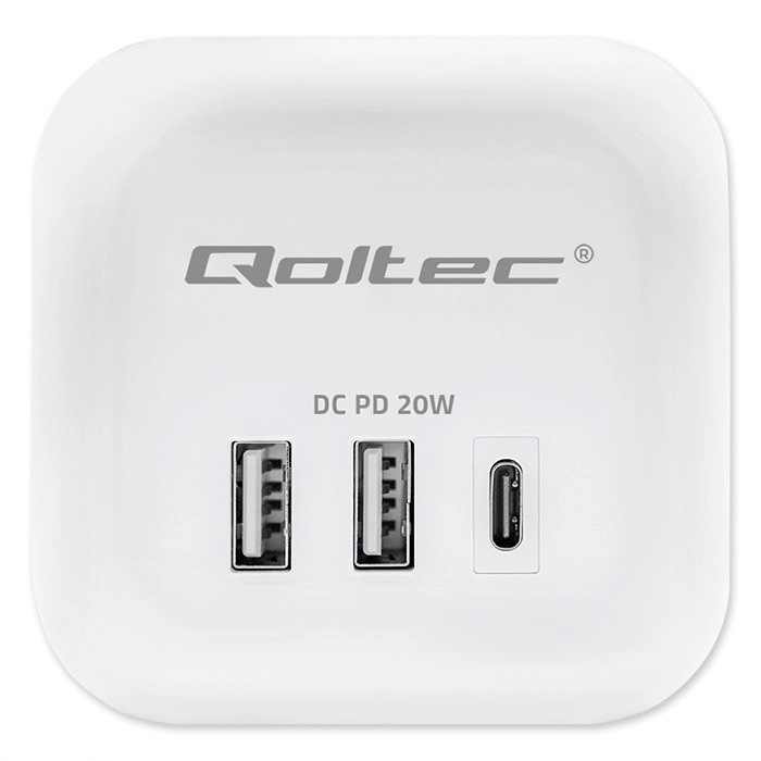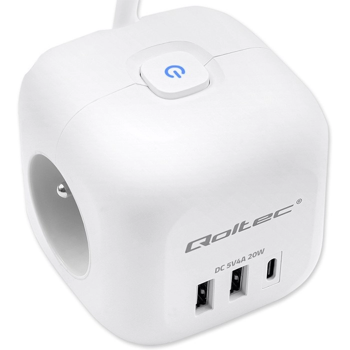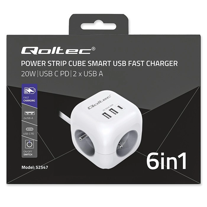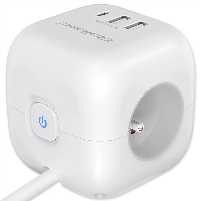 Gennemtænkt portplacering - ingen flere stik, der blokerer hinanden, eller kabelrod. Med ergonomisk placerede 3 AC-udtag på siderne af kuben er det nemt at tilslutte selv større stik uden at de spærrer for hinanden. På fronten findes 2 USB-A-porte og 1 USB-C PD 20W-port til hurtig opladning af smartphone, tablet eller hovedtelefoner uden behov for separate opladere.