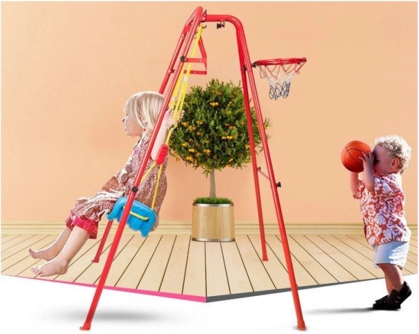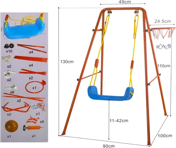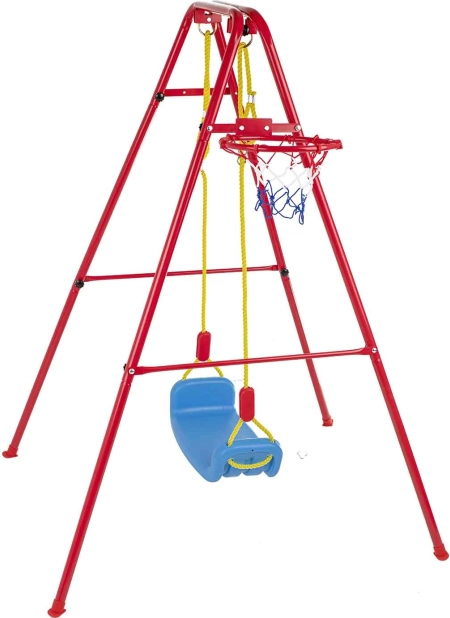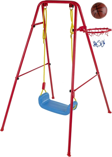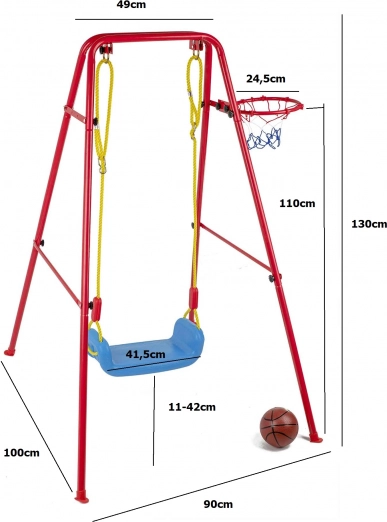 Denne alsidige havegynge kombinerer populær gyngeleg med basketballsjov. Det stabile metalstel med rørdiameter på ca. 2,5 cm og stærkt reb bærer det brede plastiksæde (ca. 43 × 25,5 cm) for komfortabel og sikker brug. Der medfølger en basketballkurv, som nemt kan fastgøres på stellet, samt minibold og pumpe til spil med det samme.