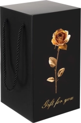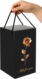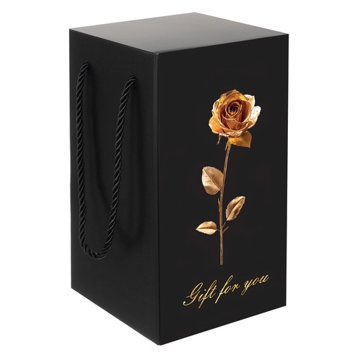 Elegant gaveindpakning: Rosen er omhyggeligt pakket i en sort gaveboks med design af en gylden rose, klar til enhver lejlighed. Boksen er udstyret med komfortable sorte snorhåndtag.
