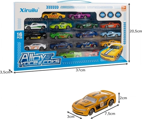 Et farverigt sæt med 16 metalbiler i skala 1:64, der giver timevis af sjov for små racerkørere og samlere. Bilerne har robuste metalkarosser, hjul der roterer frit og livlige farver, som stimulerer fantasien. Et godt valg til racerlege, bytrafik og fælles leg for flere børn.