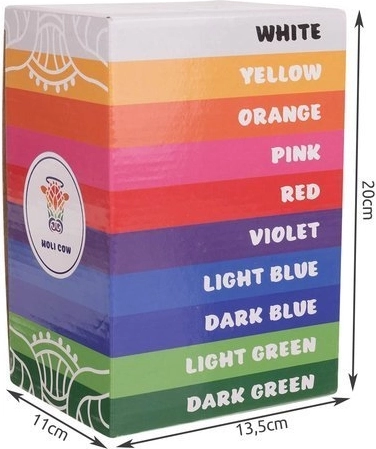 Oplev stemningen fra farvefestivaler med et komplet sæt af 10 markante nuancer. HOLI farvepulver er lavet af majsstivelse med kvalitetsfarvestoffer, hvilket gør det let, svævende og skaber fotogene effekter ved kast i luften og til gruppeevents.