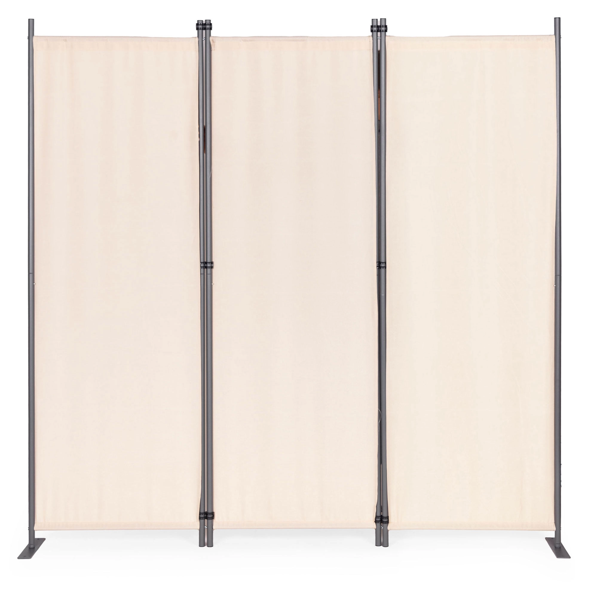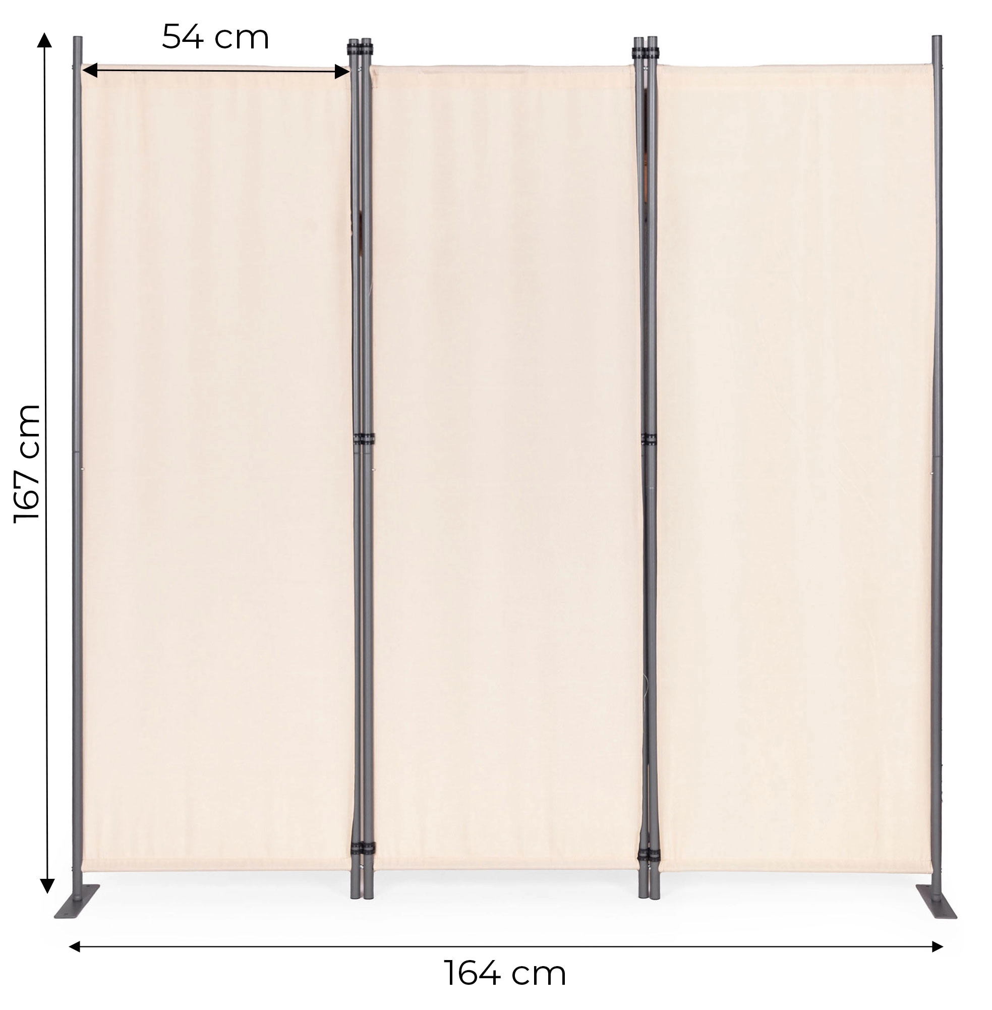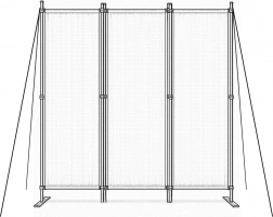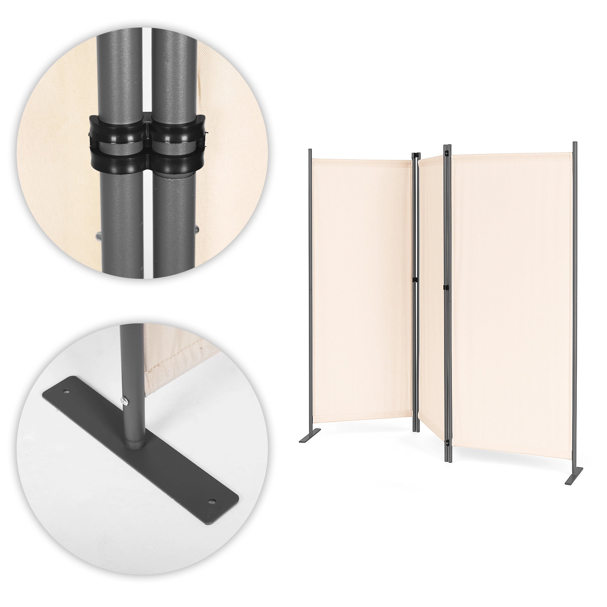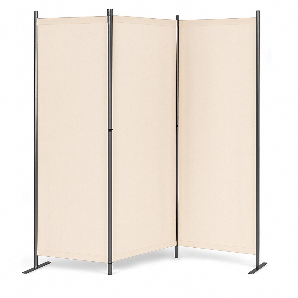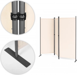 Solide panelkoblinger gør nem samling og foldning mulig. Den stabile metalbase har praktiske monteringshuller til ekstra fastgørelse i underlaget. Takket være den brede støtte fordeles vægten jævnt og forhindrer væltning, selv på ujævne overflader. Medfølgende monteringsudstyr øger stabiliteten og brugersikkerheden ved at holde skærmvæggen stabil selv i blæsende forhold.