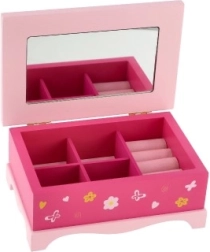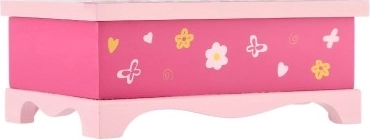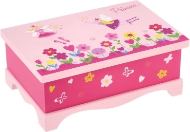 Dette lyserøde træ-smykkeskrin Princess kombinerer et magisk udseende med praktisk inddeling. Takket være spejlet på lågets inderside og de fem gennemtænkte rum hjælper det med at holde smykker og småting pænt organiseret. Den fine blomsterdekoration og teksten Princess skaber en eventyrlig atmosfære, der passer perfekt på børneværelset.