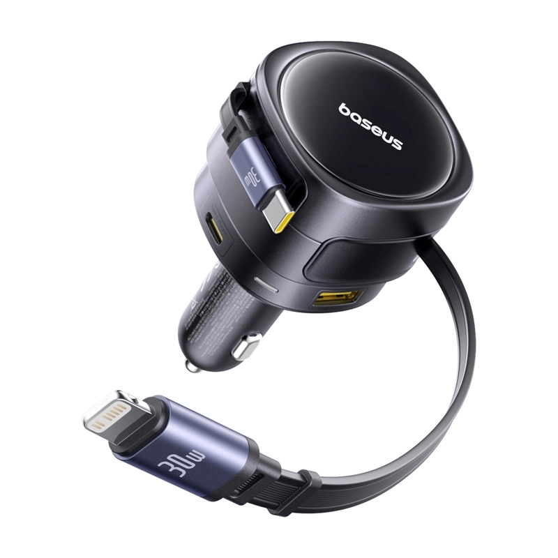 Baseus biloplader tilbyder mulighed for at oplade fire enheder på én gang takket være de to indbyggede kabler (USB-C og Lightning) og yderligere to porte (USB-C og USB-A).