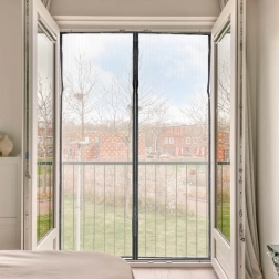 Praktisk myggenet med fint, holdbart polyesterstof, der holder insekter ude og samtidig ikke mørklægger rummet. De stærke magneter i midten sikrer jævn og automatisk lukning efter hver passage – ideelt til hjem med børn og kæledyr.
