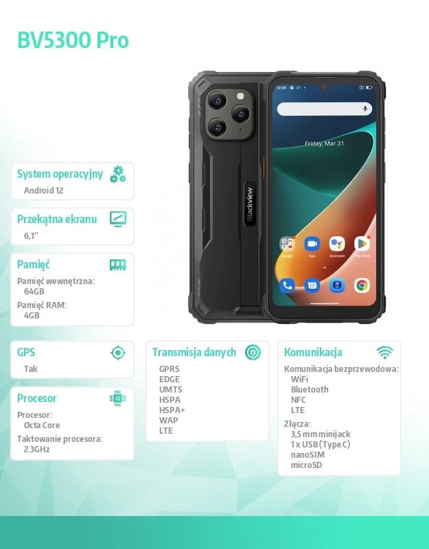 Blackview BV5300 Pro udmærker sig med sin 6,1" IPS-skærm, som tilbyder et klart og skarpt billede med en opløsning på 1560 x 720 pixels. Den kraftige ottekernede MediaTek Helio P35-processor når op til 2,3 GHz, hvilket sikrer hurtig og flydende systemydelse, understøttet af 4 GB RAM og 64 GB intern lagerplads. Hukommelsen kan udvides med et microSD-kort op til 512 GB, hvilket giver rigelig plads til alle dine behov.