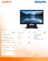 Philips-skærmen med en diagonal på 21,5 tommer er udstyret med touch kontrol teknologi, der muliggør 10-punkts multitouch, hvilket er ideelt til brug i interaktive applikationer. Takket være det anvendte VA-panel tilbyder skærmen skarpe detaljer og brede betragtningsvinkler, hvilket sikrer en fremragende oplevelse fra enhver vinkel.