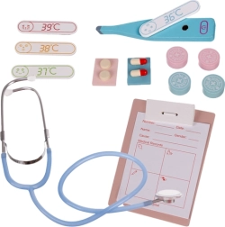 Sættet indeholder forskellige instrumenter inklusive stetoskop, termometer og tandmodel, hvilket giver barnet en komplet oplevelse som læge.