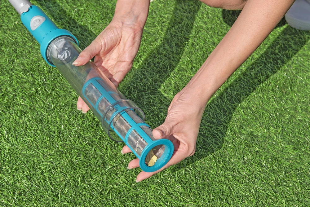 Den trådløse poolstøvsuger Bestway AquaSurge sparer tid og kræfter. Takket være den gennemsigtige opsamlingsbeholder på 0,54 l kan du straks se det opsamlede snavs, og det fine filter fanger blade, sand og små aflejringer. Den tredelte teleskopiske aluminiumsstang giver komfortabel rækkevidde over hele poolens overflade og nem manøvrering ved vægge og i hjørner.