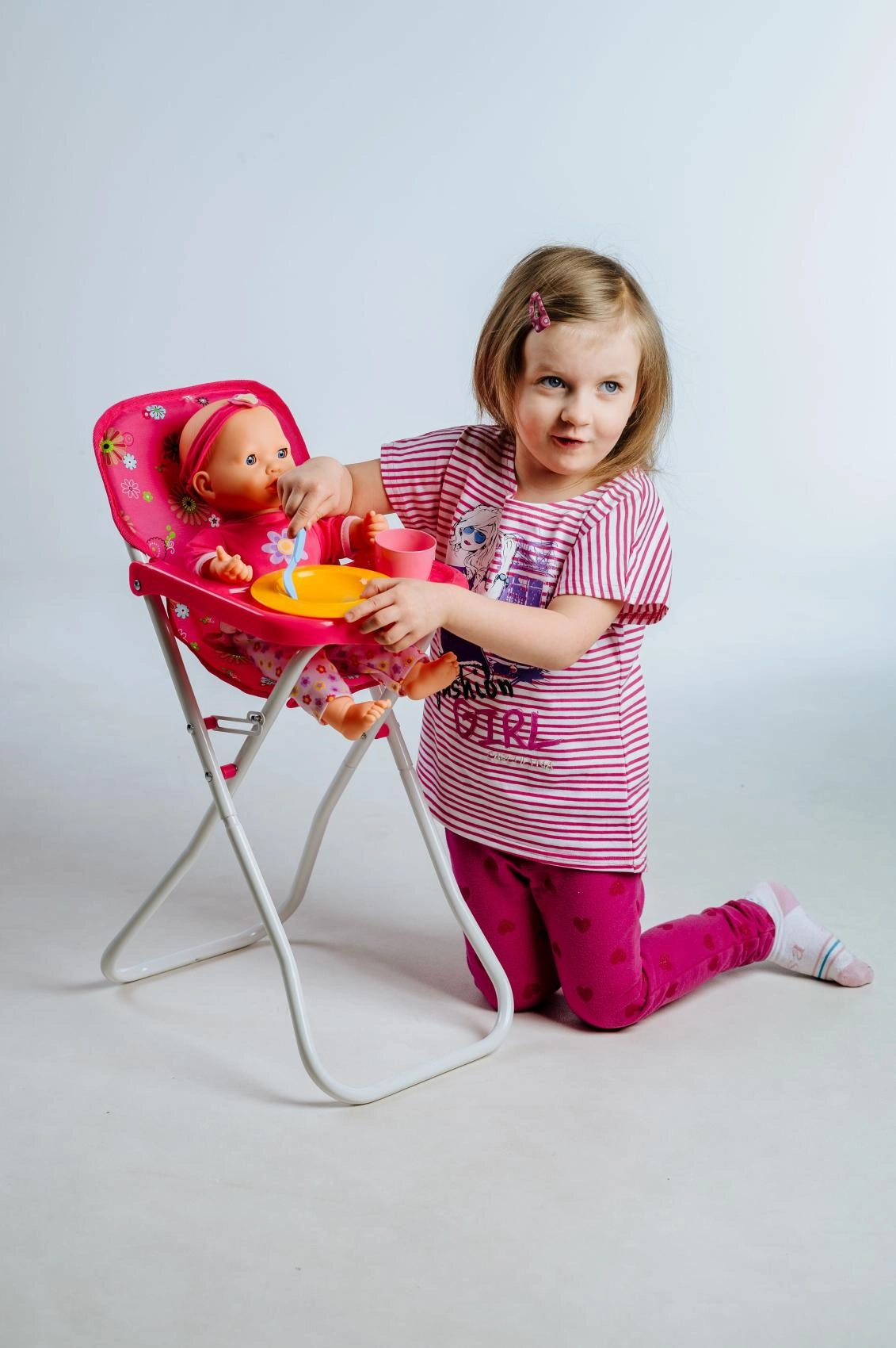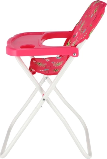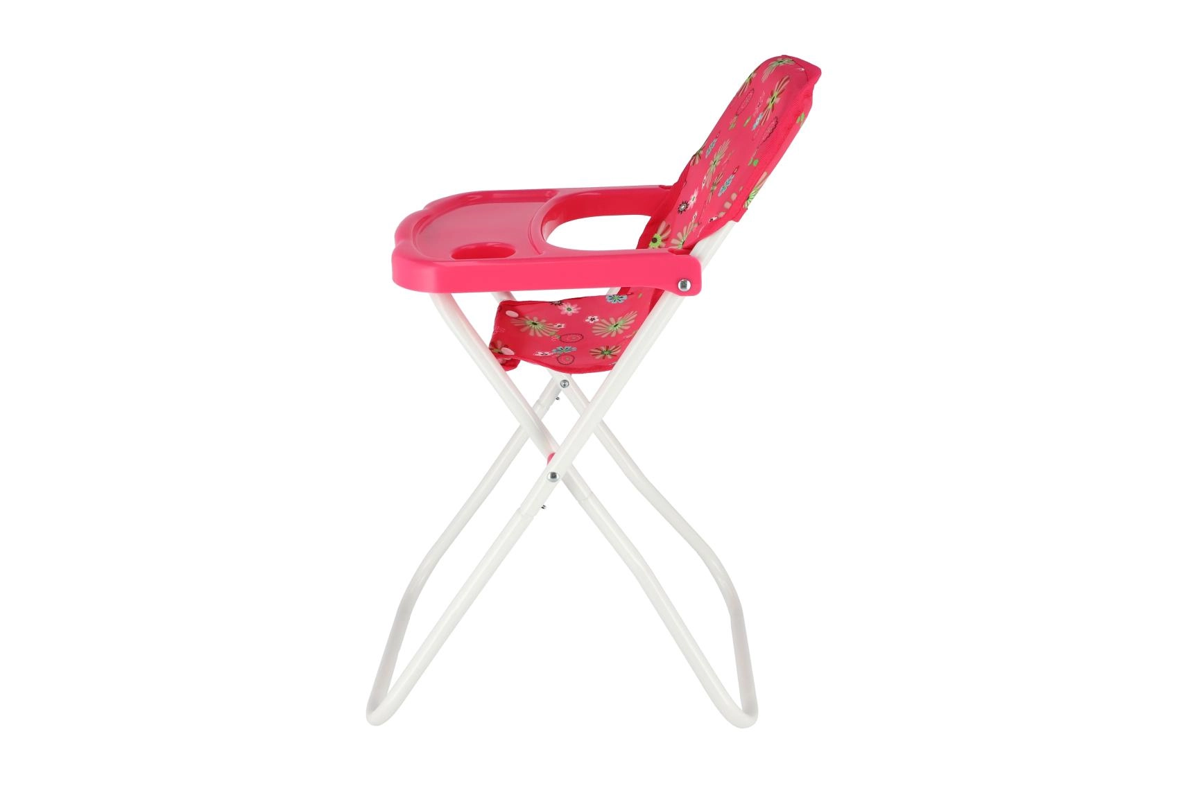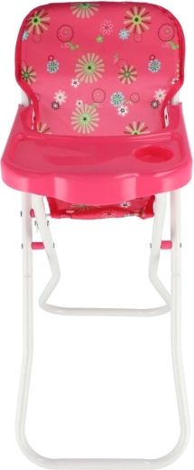 Denne høje dukkestol vil glæde alle små omsorgspersoner. Den tilbyder behagelig siddestilling med blomstret betræk, en praktisk plastbakke til fodring og en let, men stabil metal konstruktion. Takket være det pladsbesparende design kan den nemt bæres og opbevares.