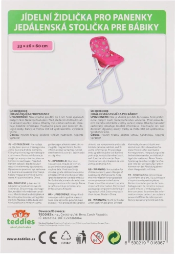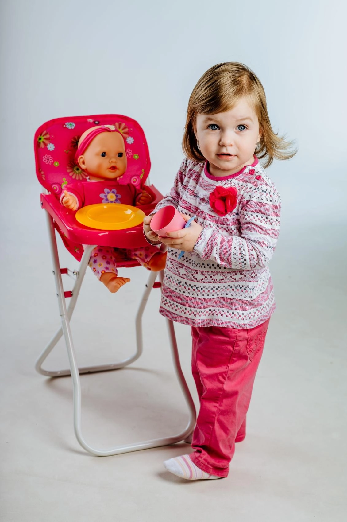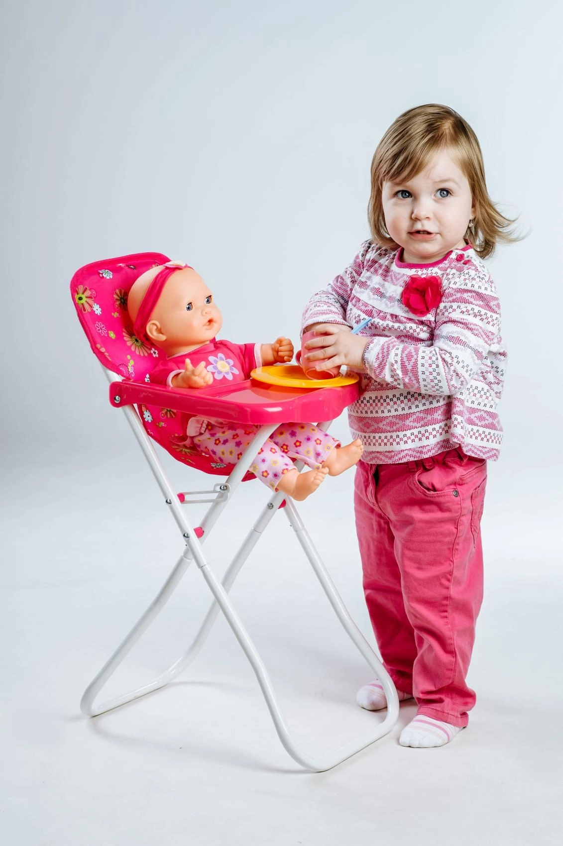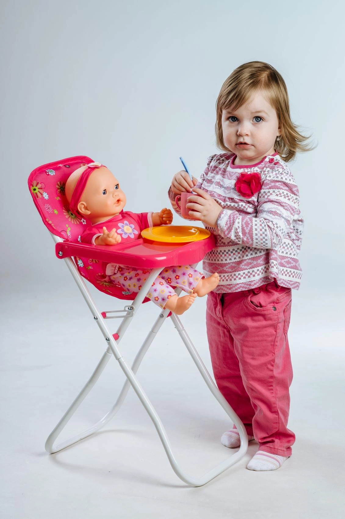 Denne høje dukkestol vil glæde alle små omsorgspersoner. Den tilbyder behagelig siddestilling med blomstret betræk, en praktisk plastbakke til fodring og en let, men stabil metal konstruktion. Takket være det pladsbesparende design kan den nemt bæres og opbevares.