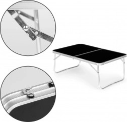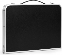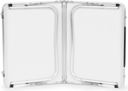 Dette kompakte bord er udstyret med beskyttelse mod utilsigtet sammenklapning og et behageligt bærehåndtag, hvilket garanterer nem håndtering. Det kan foldes til en kuffertform, hvilket letter transport og opbevaring.
