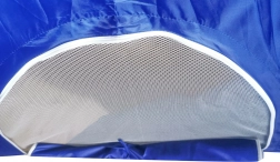 Textil med sølvfarvet inderlag reflekterer skadelige stråler, og topventilationen sikrer bedre luftcirkulation uden overophedning.