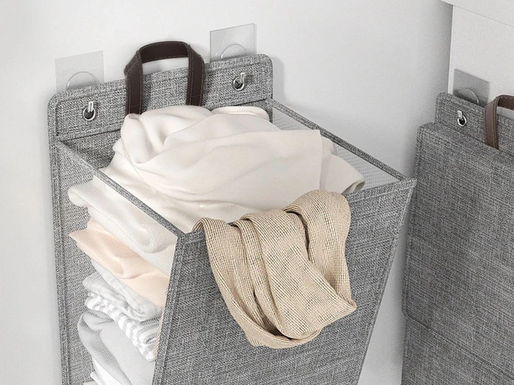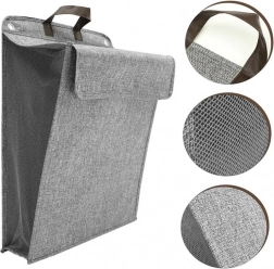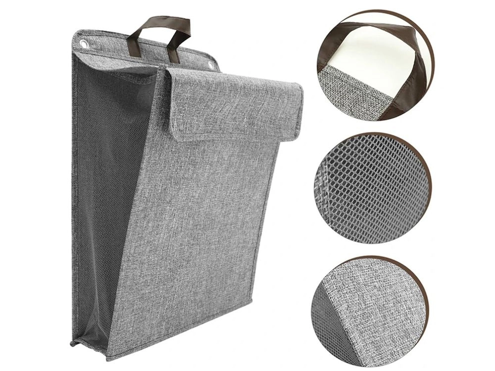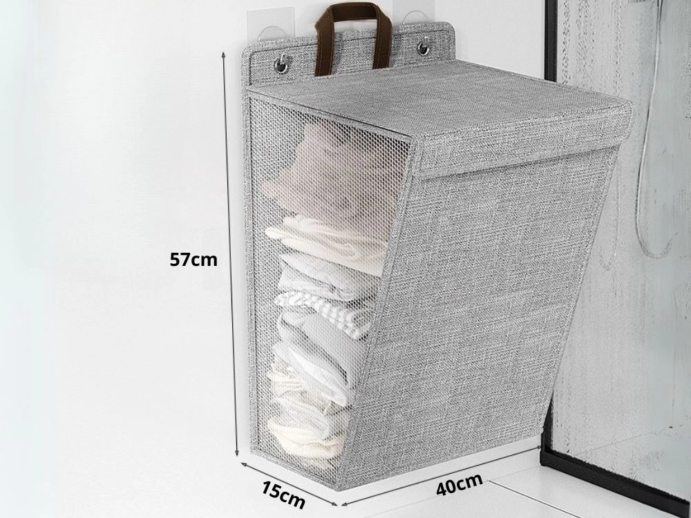 Den elegante grå vasketøjskurv er designet til små badeværelser, garderober og bryggerser. Takket være muligheden for ophæng på væg eller dør udnyttes pladsen effektivt, mens de forstærkede sider bevarer formen selv ved fuld last. Det åndbare net fremmer luftcirkulation, så tøjet ikke bliver indelukket.
