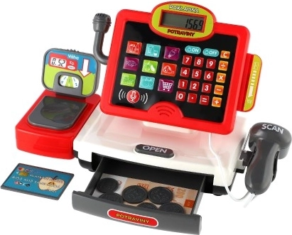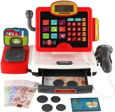 Sjovt og lærerigt elektronisk kasseapparat til børn med tilbehør til små købmænd. Indeholder lys- og lydscanner, legetøssedler og -mønter, slot til kreditkort, fungerende lommeregner og vægt til frugt og grønt. Den ideelle legetøj til at udvikle fantasi og grundlæggende regnefærdigheder.