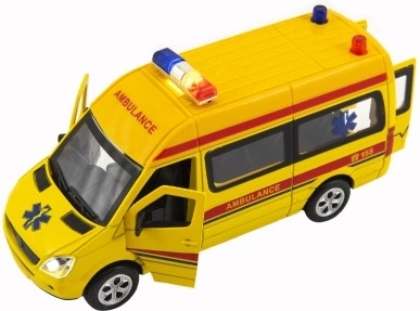 Denne detaljerede ambulance kombinerer et solidt metalchassis med robuste plastdele og er ideel til kreativ leg. Takket være pullback-drev kører den uden fjernbetjening, mens åbningsbare for- og bagdøre øger autenticiteten og interaktiviteten.