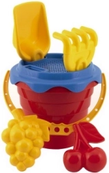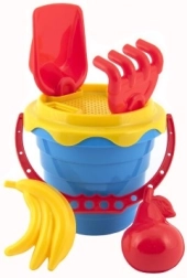 I sættet finder du alt, hvad du behøver til leg med sand, inklusive en spand, en si, en skovl, en rive og to forme.