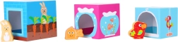 Seks søde trædyr hører til i de tilsvarende åbninger i klodserne. Børn øver sortering, parring og fantasifuld leg.