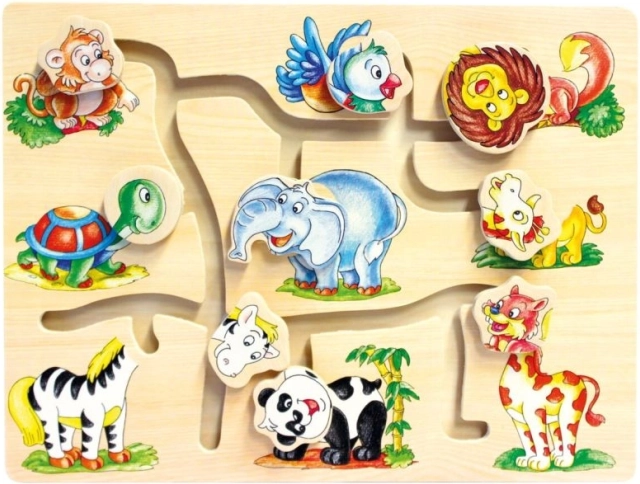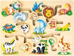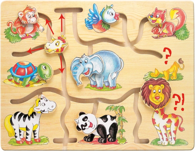 Den træbaserede labyrint med dyr er et ideelt redskab til at udvikle børns færdigheder allerede fra tidlig alder. Takket være de farverige motiver og bevægelige dele forstår børnene nemt, hvordan man matcher det rigtige hoved med dyrets krop, samtidig med at hånd-øje-koordinationen trænes.