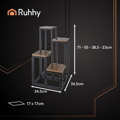 Stilfuld stående blomsterstand RUHHY er en fire-niveau konstruktion, der giver mulighed for at fremvise flere planter på et lille område. Moderne design med metalramme og træhylder passer til ethvert interiør. Stabil og robust struktur kan bære op til 50 kg belastning og er udstyret med gulvbeskyttelse gennem justerbare ben.