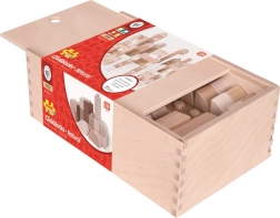 Byggesættet er lavet af holdbart træ med glat overflade for sikker leg. Den praktiske træboks med skydelåg gør det let at holde orden på børneværelset.