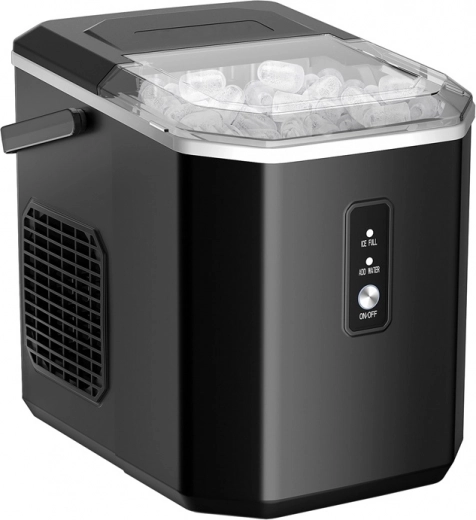 Praktisk design: Takket være det behagelige håndtag og det kompakte design (29,5 × 29 × 23,5 cm) passer ismaskinen nemt i bagagerummet eller skabet og kan derfor let tages med på weekendture, havefester m.m.