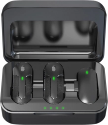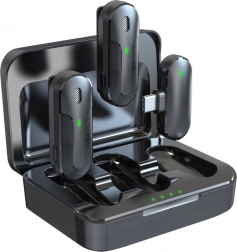 Mikrofonerne er udstyret med praktiske clips til nem fastgørelse på tøjet. Ladeetuiet giver beskyttelse og forlænger driftstiden, muliggør fire opladninger, så du kan optage hele dagen uden bekymring for afladning.