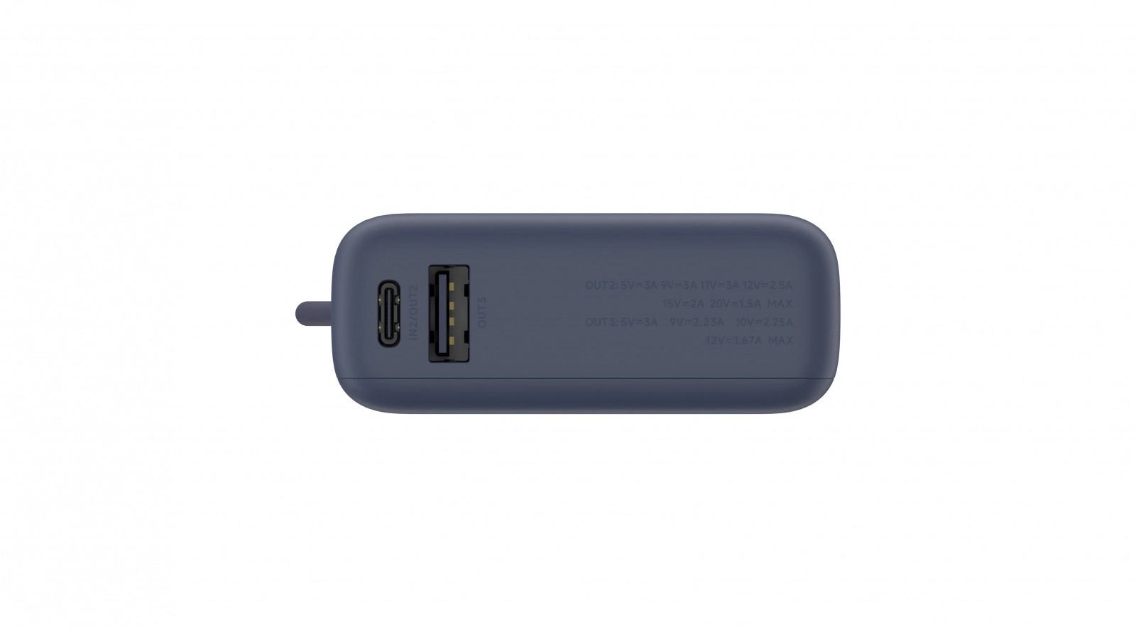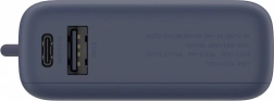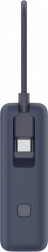 Powerbanken har tre udgange: en USB-C-port, et indbygget USB-C-kabel og en USB-A-port. Det gør det muligt at oplade op til tre enheder samtidigt uden tab af effekt. Det integrerede kabel øger komforten og eliminerer behovet for at medbringe ekstra kabler.