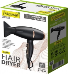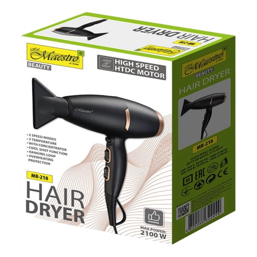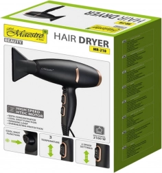 Hårtørrer Maestro er udstyret med to koncentratorer til præcis styling og målretning af luftstrømmen der, hvor den er mest nødvendig. Den tilbyder to blæsehastigheder og tre temperaturindstillinger, hvilket gør det muligt at tilpasse funktionen efter individuelle behov og hårtype.