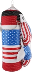 Boksebolden og handskerne er designet med amerikansk flagmotiv, hvilket giver et legende og farverigt udseende.