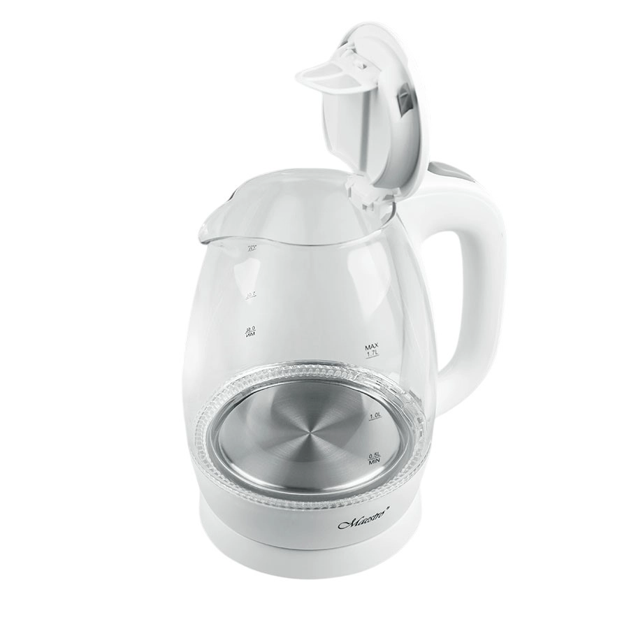 Elkedlen Maestro tilbyder blå LED-belysning under kogning, som giver køkkenet et moderne udtryk. Den praktiske åbningsbare låg og vandstandsmåler gør det nemt at fylde og kontrollere vandindholdet. Takket være drejefoden på 360° er kedlen velegnet til både højre- og venstrehåndede, og kabelopbevaring hjælper med at holde orden på køkkenbordet.