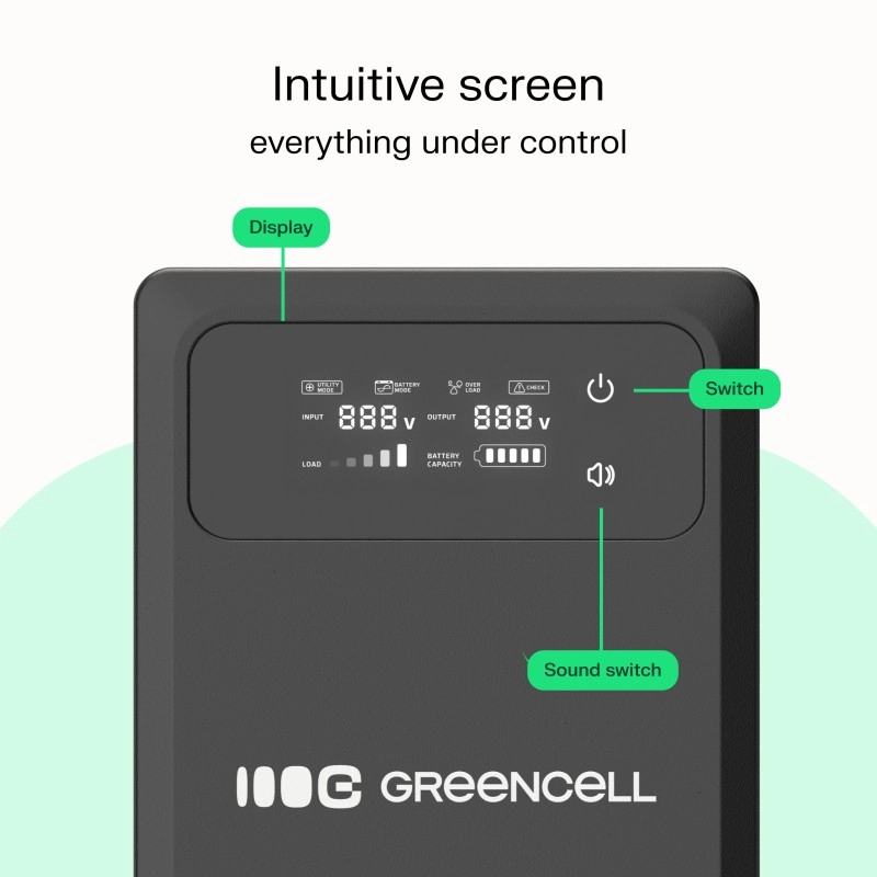 Apparatet har en læsbar LCD-skærm, der informerer om status og batteriopladning. En fysisk lydafbryder giver mulighed for hurtig afbrydelse af lydalarmen, og den udskiftelige sikring kan nemt erstattes uden at åbne kabinettet.