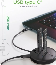 Denne enhed fungerer som en dokningsstation for to M.2 NVMe SSD-drev, når den er tilsluttet en computer via det integrerede USB-C-kabel. Den leverer hurtig dataoverførsel mellem begge drev og understøtter stor lagerkapacitet samt systembackup i realtid.