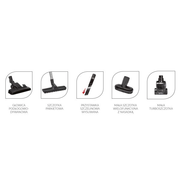 Støvsugerens udstyr: Sættet indeholder et mundstykke til hårde gulve og tæpper, en parketbørste, en lille turbobørste, et udtrækkeligt fugemundstykke og en lille multifunktionsbørste med adapter.