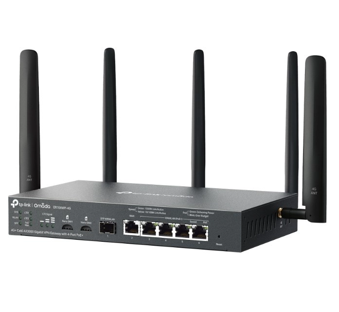 Omada ER706WP netværksgateway tilbyder højhastighedsforbindelse med den nyeste Wi‑Fi 6-teknologi og 4G+ Cat6-understøttelse til krævende brugere. Nyd en hurtig og stabil forbindelse, ideel til jævn streaming og hurtige downloads.