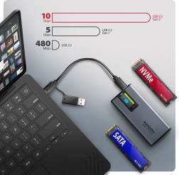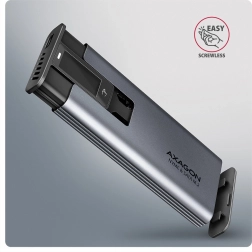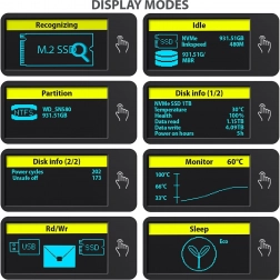AXAGON-coveret er udstyret med et avanceret LED-display, som giver et øjeblikkeligt overblik over drevets status. Displayet viser oplysninger som drevdetektion, filsystem, temperatur, drevtilstand, dataoverførselshastighed og samlet driftstid. Med temperaturmonitorering i realtid og strømsparende tilstand har du fuld kontrol over dit drev.