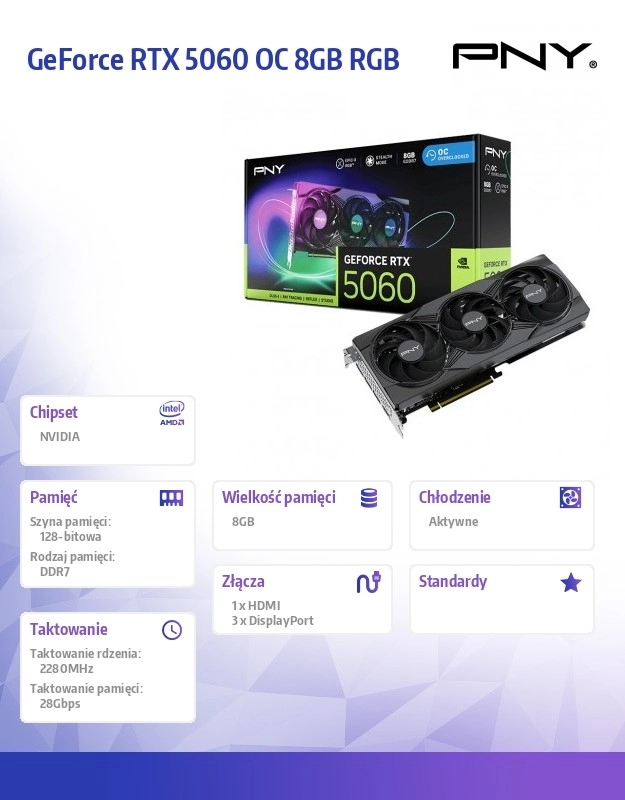 Grafikkortet PNY GeForce RTX 5060 imponerer med den forbedrede NVIDIA Blackwell-arkitektur, som leverer en hidtil uset grad af ydeevne og effektivitet. Dette kort er ideelt til krævende spilTitler med høj billedfrekvens.