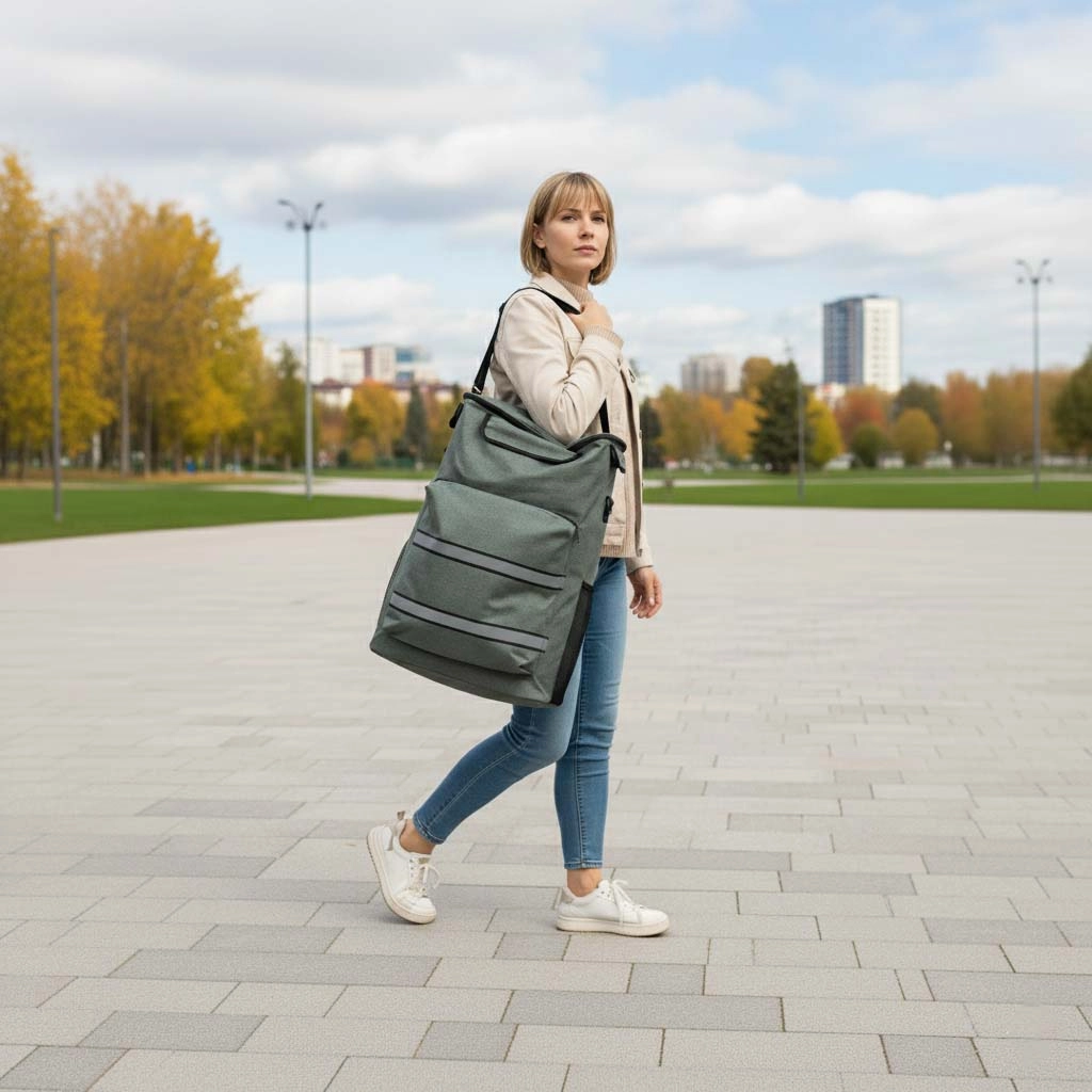 Takket være de store hjul og det roterende håndtag er håndteringen glidende selv på ujævnt underlag. Refleksbånd øger synligheden i tusmørke, så mørket ikke overrasker dig. Tasken kan let tages af stellet, hvilket gør transport og opbevaring enklere.