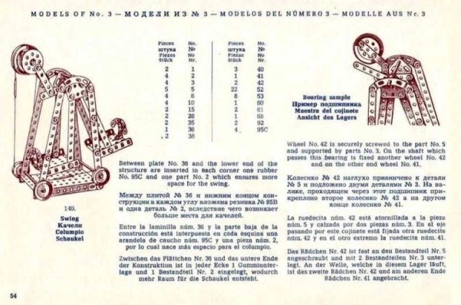 I kassen finder du en stor, 94-siders instruktionsbog i 30’er-stil, udarbejdet til sættene MERKUR Classic C03, C04 og C05. Du kan samle op til 141 forskellige modeller – fra køretøjer og maskiner til tekniske mekanismer. Den perfekte gave til kreative børn fra 8 år, teknikentusiaster og elskere af retrodesign.